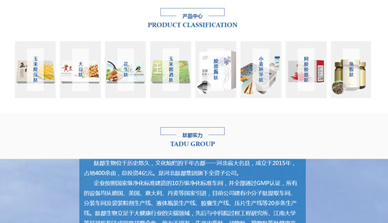 河北肽都生物科技有限公司位于歷史悠久,文化燦爛的干年古都一一河北省大名縣,成立于2015年,占地400余畝,總投資4億元。是河北肽都集團旗下全資子公司。企業(yè)按照國家級凈化標準建造的10萬級凈化標準車間,并全部通過GMP認證,所有的設備均從德國、美國、意大利、丹麥等國家引進,目前公司建有小分子肽提取車間、分裝車間及袋裝粉劑生產線、液體瓶裝生產線、膠囊生產線、壓片生產線等20多條生產線。肽都生物立足于大健康行業(yè)的尖端領域,先后與中科院過程工程研究所、江南大學等科研機構達成深度戰(zhàn)略合作。致力于研發(fā)、生產中藥肽、動物肽、植物肽等小分子活性肽產品。